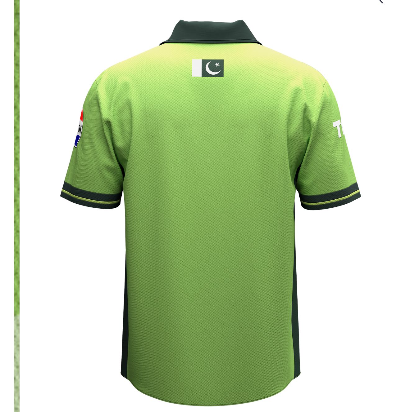 Show your pride and support for the Pakistani cricket team with the exclusive Champions Trophy Jersey 2025. This vibrant green jersey features a dynamic design with abstract geometric patterns that exude energy and passion. The dark green collar and sleeve cuffs add a stylish contrast to the lighter green body. On the front, "PAKISTAN" is prominently displayed in bold, dark green letters, while the left chest proudly displays the text "CHAMPIONS ICC TROPHY 2025 - PAKISTAN." A star design on the right chest area, complete with the initials "SB," adds an extra touch of uniqueness. The right sleeve showcases the Pepsi logo, and the left sleeve features the text "TCL."