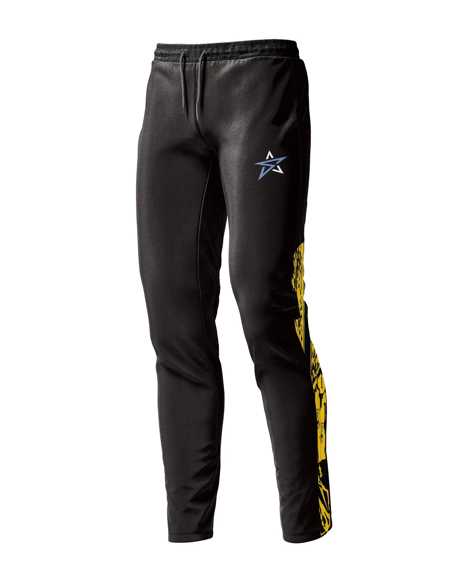 Upgrade your wardrobe with our Mustard Accent Fashion Bottoms. These black trousers feature small mustard printed panels on the sides, adding a touch of modern flair. The blue star detail on the left leg creates a striking contrast, making these trousers stand out in any crowd.